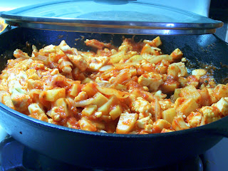 3. Stir in cauliflower, potato, and tomato mixture. Season with salt and pepper if desired. Cover, bring to a boil. Turn down heat and simmer for 10 minutes. Uncover, and simmer for 5 more minutes until cauliflower and potato are tender.